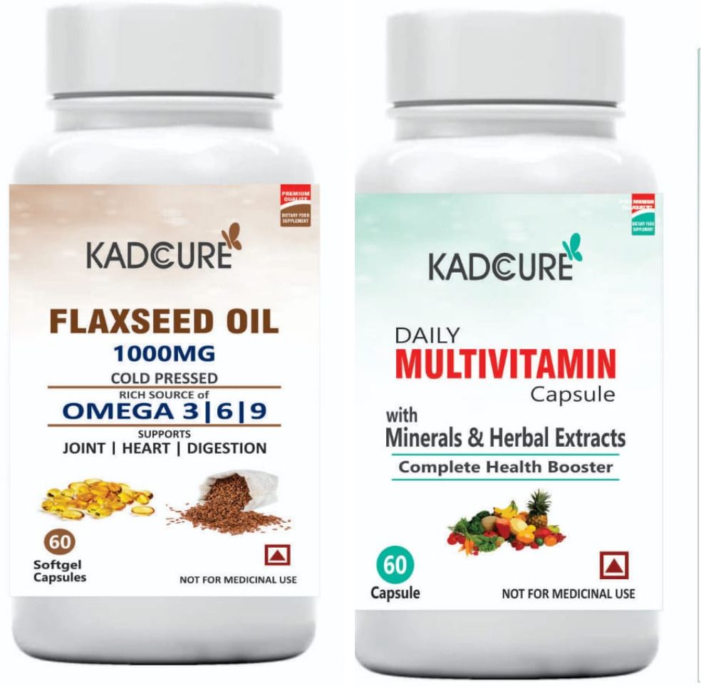| Kadcure Flaxseed Oil Capsules Supports cardiovascular health and maintains cholesterol levels, Rich in ALA (Alpha-linolenic acid), a plant-based Omega-3, Promotes healthy skin, hair, and joint flexibility, No preservatives, gluten, or artificial additives and 100% cold-pressed oil for maximum potency and purity. These multivitamins contain 100% RDA of immunity boosters such as Vitamin A, Vitamin C, Vitamin D, Vitamin E, Folic Acid, Zinc, Copper, Iron, and more making it a potent formula to strengthen your immunity. It fuels you for the most intense training and helps you power through workout sessions for better athletic performance |